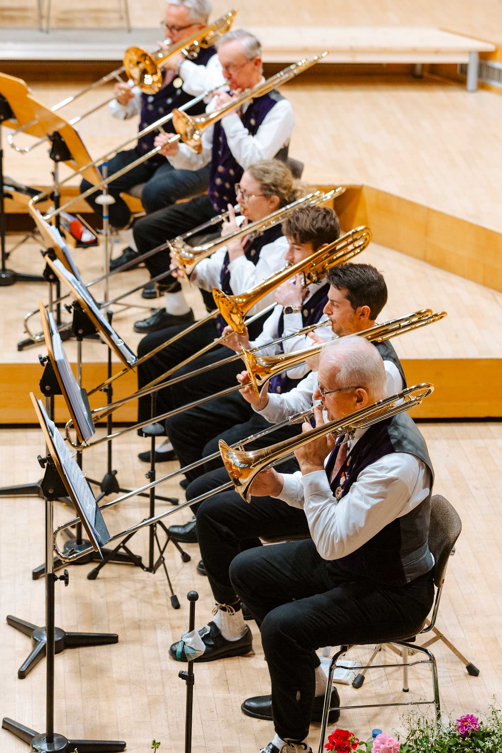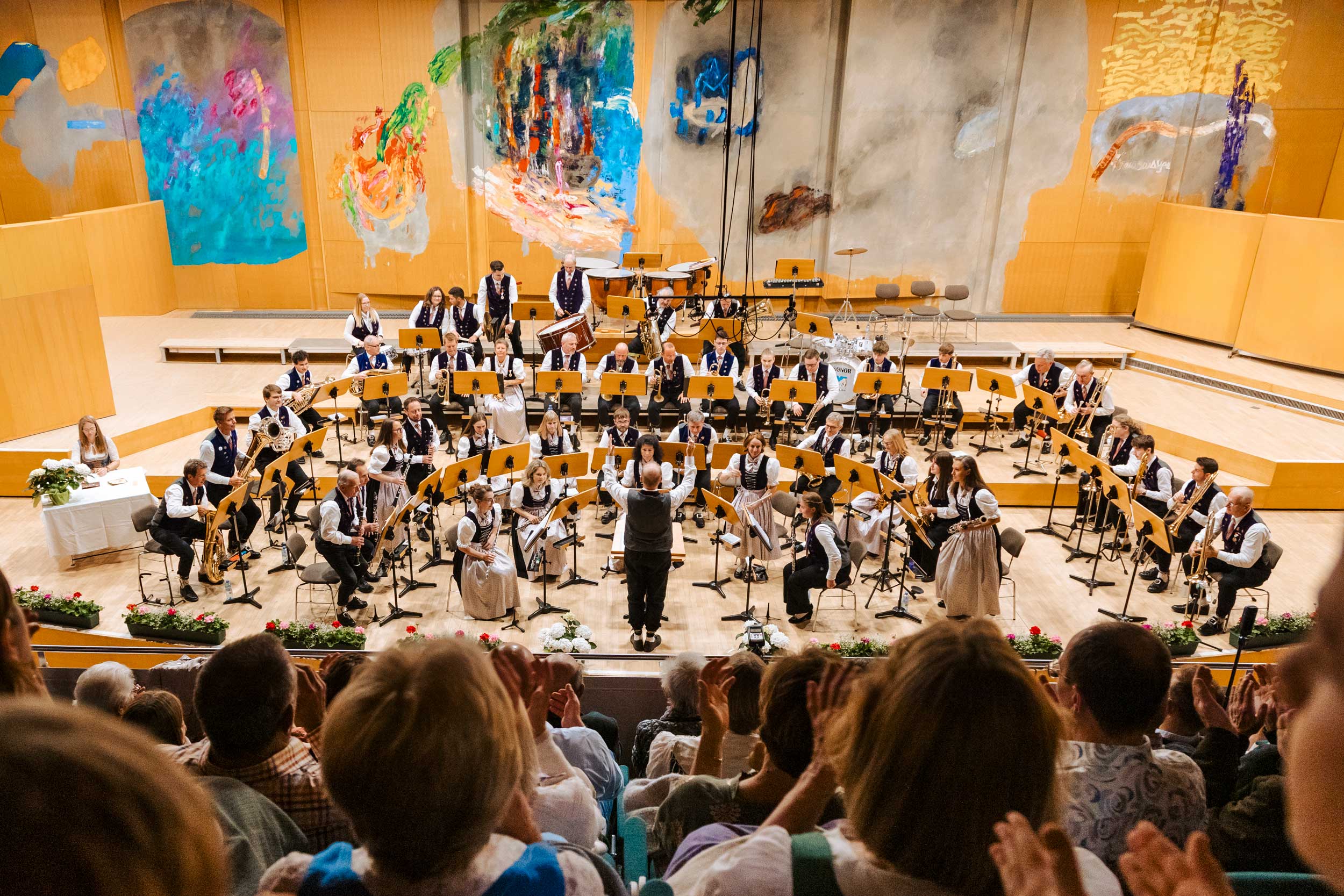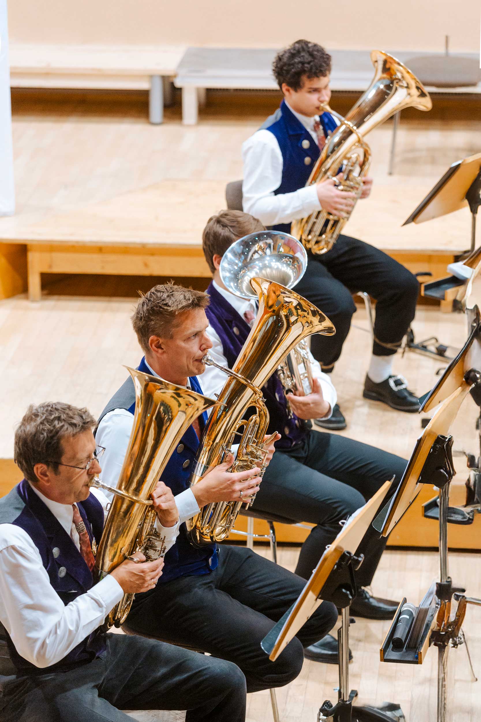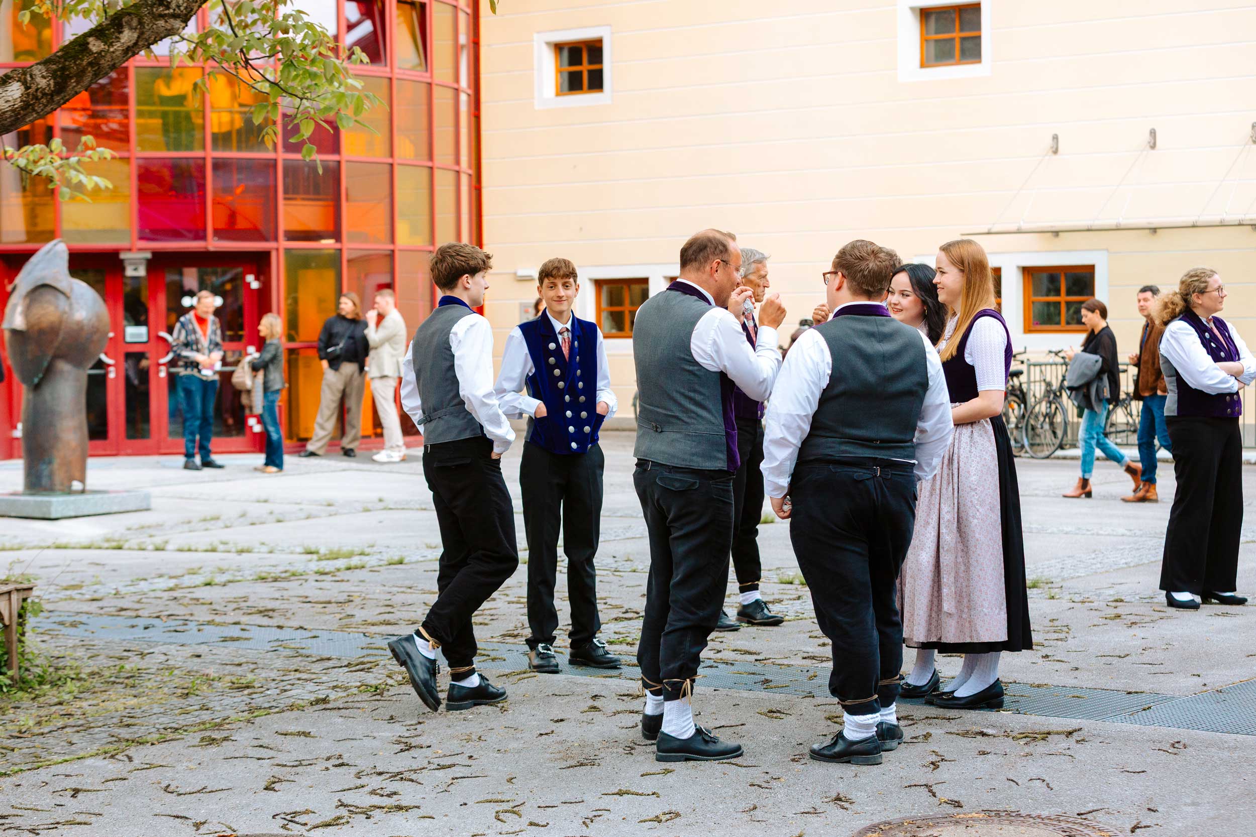 Neben dynamischen Konzertfotos im Saal entstanden auch Orchesterportraits im Außenbereich – von Fotos des gesamten Orchesters bis zu kleineren Register- und Gruppenaufnahmen. Die Mischung aus traditioneller Tracht, konzentrierter Probenarbeit und der besonderen Atmosphäre des Orchesterhauses macht diese Strecke für mich zu einem besonderen Highlight in meinem Portfolio für Konzertfotografie und Orchesterfotos in Salzburg.